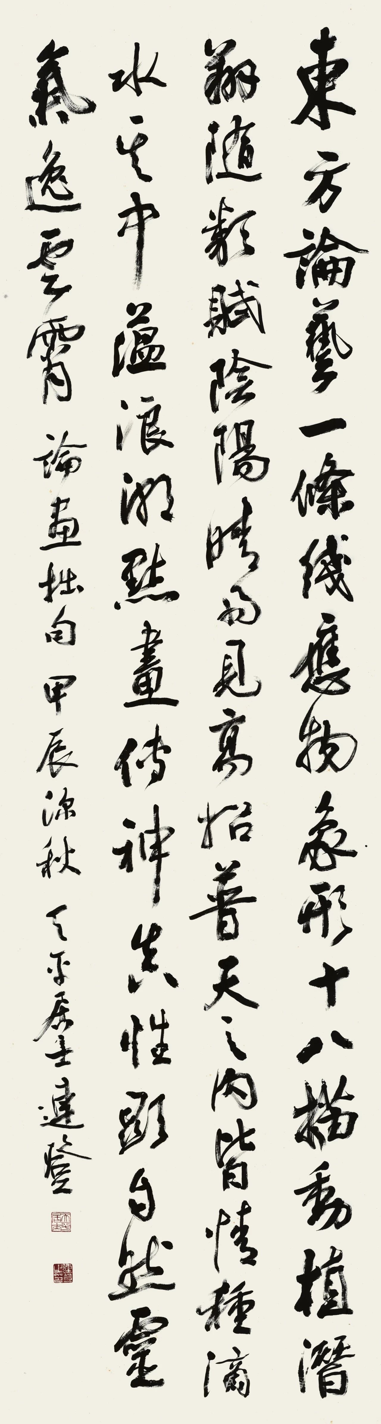 释文:东方论艺一条线,应物象形十八描。动植潜翔随类赋,阴阳晴雨见高招。普天之内皆情种,滴水其中蕴浪潮。点画传神真性显,自然灵气逸云霄。